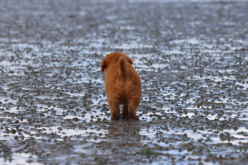 Vandaag weer een mooi avontuur voor de pups! Een echte Salty River Toller heeft voordat zij/hij het nest verlaat kennis gemaakt met het zoute water waar de kennel naar is vernoemd. Vandaag stond deze 'doop' op het programma. De baasjes van (Salty River) Bailey assisteerden, dus Bailey kon alvast kennis maken met zijn toekomstige vriendje Chuck. Na een lekker rondje crossen in de zoute modder was het weer tijd om naar huis te gaan, en daar liggen ze nog steeds diep onder zeil..... vanaf nu mogen ze echt Salty River Tollers genoemd worden!